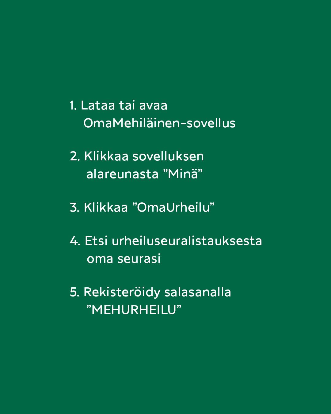 Lataa OmaMehiläinen-sovellus älypuhelimeesi tai kirjaudu verkkopalveluun, niin pääset rekisteröitymään OmaUrheiluun. Rekisteröitymällä OmaUrheilu -palveluun ja asioimalla Mehiläisessä kerrytät seuralle maksettavaa tukipottia. Myös seuran kannattajiksi rekisteröityneiden perheenjäsenten ja muun lähipiirin asiointi Mehiläisessä kasvattaa seuran tukipottia.